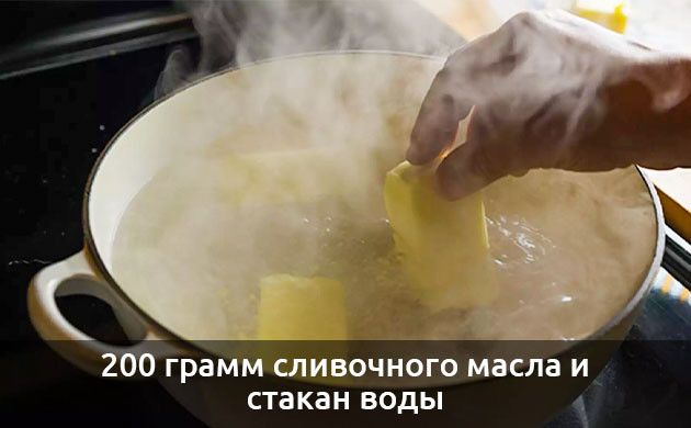 В кастрюлю с толстым дном или глубокую сковороду с антипригарным покрытием помещается 200 грамм сливочного масла и вливается стакан воды.
