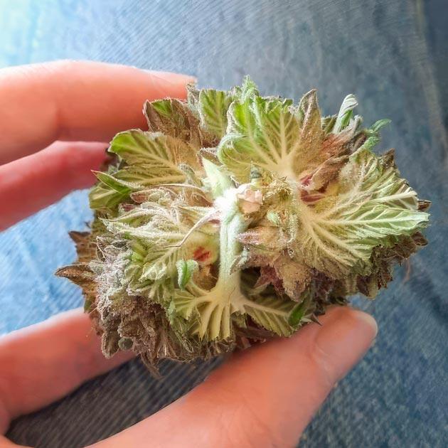 Сейчас кусты полностью остановились в росте, и все питание уходит в налив шишек. Структура плотная, листья здоровые, цвет насыщенный, на свету блеск трихом невероятно радует глаз. При ближайшем осмотре заметил еще одну мутирующую шишку, которая тоже выглядит будто сдвоенной. Причем она была уже на другом растении. Причудливая генетика.