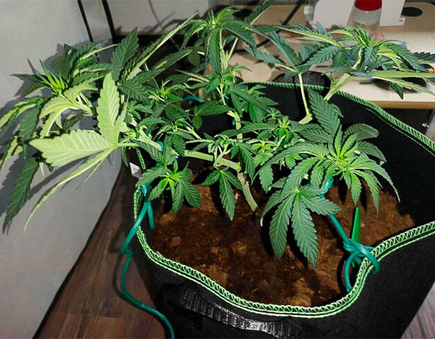 Вместе с тем начал легкую LST-тренировку. Сначала для первой малыхи, а через день и для второй. Растягивал ветки и листья при помощи садовой проволоки. Следовал рекомендациям и просто фиксировал побеги так, чтобы они не затеняли друг друга и занимали свое собственное пространство под лампой. Световой режим все еще держу 18/6. Лампа теперь выдает около 38-44 тысяч люкс на уровне верхушек. По идее, это оптимальный уровень для активной вегетации, и растения чувствуют себя под ним отлично.