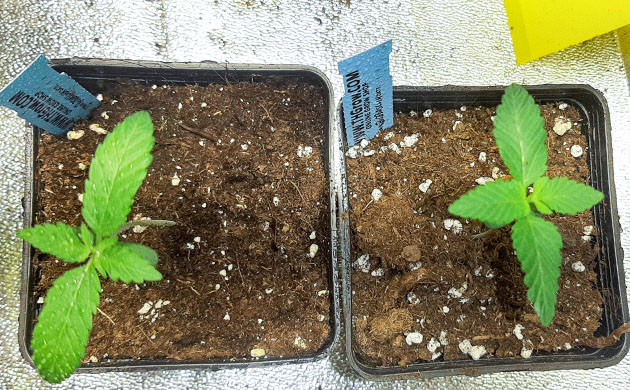 Проращивал семена в стакане с водой плюс несколько капель перекиси водорода. Они раскрылись и пустили корешки за 3 дня, после чего я отправил их в горшки по 0,6 л. Свет включен 18/6, лампа висит на расстоянии 50 сантиметров. Температура днем 24 °C, ночью опускается до 18 °C. Влажность – 75 %. Первую неделю поливал чистой водой с pH 6,0, стараясь не заливать саженцы. Никаких проблем, ростки пробили грунт, скинули каски и к концу недели сформировали первую пару листьев.