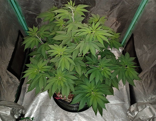 Девятая неделя, перевод в цвет, то есть смена светового режима на 12/12. К этому моменту рост куста по самой высокой коле – 66 сантиметров. Остальные плюс-минус той же длины. На 57-й день полив с удобрениями, Tiger Bloom 2,6 мл/л и Mammoth P 0,2 мл/л. Следующий полив на 59-й день с «КалМагом» и Mammoth P, без «Блума». На 61-й день полив с «Блумом» и через два дня еще один, но уже без «Блума». Получилось 4 полноценных полива за неделю. На 62-й день я заметил, что воздух в палатке очень спертый, а влажность невероятно подскочила. Причина была в забитом предфильтре, из-за чего кустик практически не получал свежего воздуха. Почистил, и всё встало на свои места.