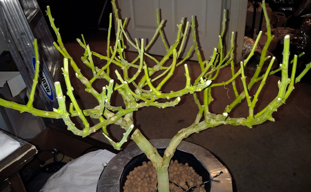 С восьмой недели я начал обрезать все маленькие веточки, которым удавалось пробиться через ScrOG. Остаются только самые крепкие и большие, которые сформировались до начала цветения. Несколько срезанных черенков отправил на ревегетацию. В резервуаре по-прежнему раствор на основе General Hydroponics, всё делаю по инструкции производителя.