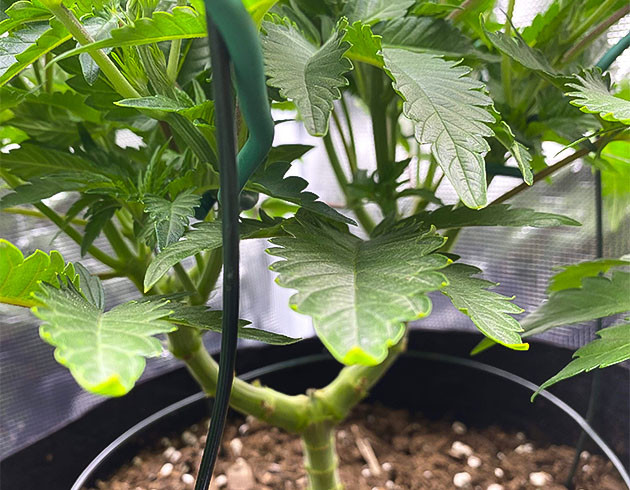 На 8-й неделе стебли развились достаточно для того, чтобы я смог убрать подпорки. Растение начинает активно вытягиваться в высоту и уже достигло 22 сантиметров. Через неделю листьев стало еще больше, а рост куста достиг 30 сантиметров. В конце девятой недели перешел на световой режим 18/6.