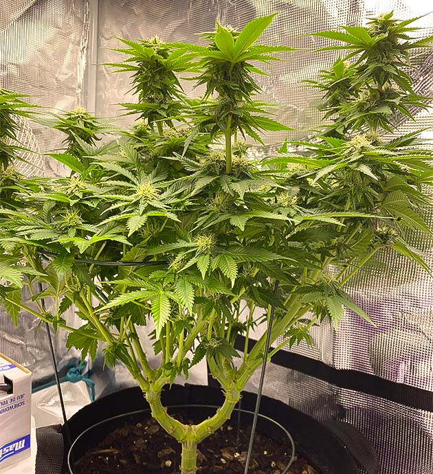 На 10-й неделе перевел куст в цветение. Световой режим установлен 12/12. Развитие идет стабильно, высота составляет 35 сантиметров. На следующей неделе прибегнул к дефолиации, чтобы избежать появления плесени и обеспечить будущим соцветиям больше света. Также я начал добавлять удобрения Big Bud по 2 мл/л. В середине 12-й недели обрезал еще несколько больших листьев и уменьшил расстояние от кроны до ламп. Потихоньку начинают формироваться бутоны.