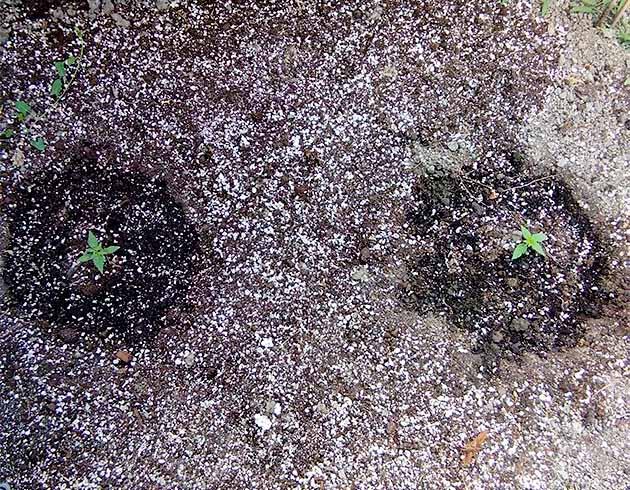 Пока цветочки в рассадных стаканах, приготовил посадочные лунки. Прикопал ведро, пролил немного вокруг и вытащил. Лунка на 12 литров готова. Засыпал подготовленный грунт плюс добавил туда же удобрение на стадию роста Powder Feeding BioGrow от Green House Feeding.