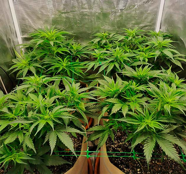К пятой неделе кустики заметно приободрились и стали выглядеть гораздо лучше, если не учитывать изначальную разницу. В этой связи я принял волевое решение и сделал топпинг на двух кустиках, которые выглядели лучше и больше. Также я растянул все четыре растения, аккуратно развел ветви, чтобы лишнего стресса не было. В середине недели сделал лёгкую дефолиацию и был в целом приободрен камбеком, который сделали растишки. Если честно, то я уже решил, что мой второй опыт будет неудачным. Не тут-то было! Начал поливать по схеме «удобрения – чистая вода – удобрения» с перерывом в сутки, лью по 350 мл, что точно немного для горшков по 15 литров. Иногда кажется, что почва даже суховата, но недолив явно лучше перелива. Удобрения те же, в том же количестве, по 3 мл/л Micro, Grow и Bloom.