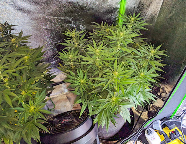 После перевода в цветение растихи получили подкормку из G.O. Thrive Grow, CaMg+ и G.O. Bud (1,32/0,66/1,25 мл/л). На кустах было достаточно много желтых и больных листов, преимущественно в нижних частях растений. Я обрезал их вместе с небольшими веточками. В целом девочки после дефолиации выглядят нормально, будто полностью оклемались от проблем.