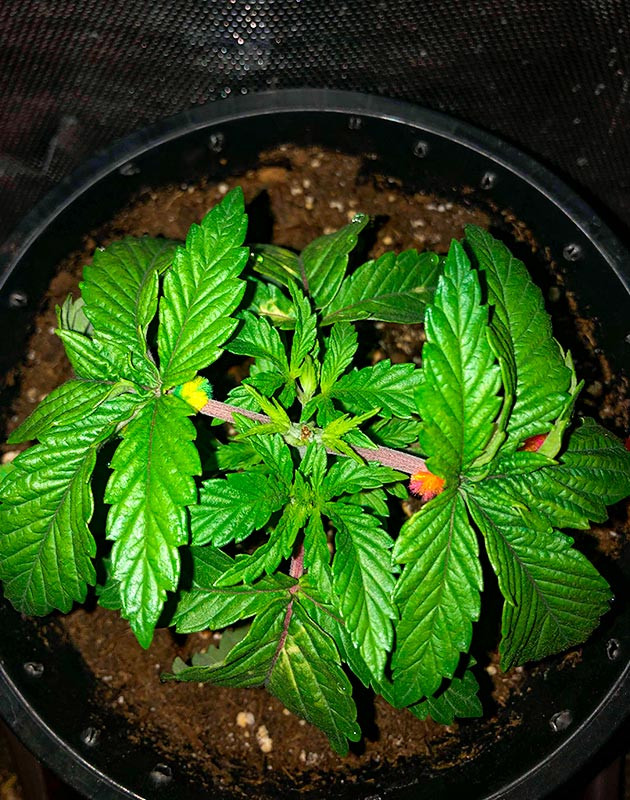 С первых же дней жизни Wedding Gelato показал себя с лучшей стороны. Он стремительно развивался, показывая мне один за другим этажи новых листьев. Буквально через день мне уже пришлось снять пленку, так как росток уперся в нее верхушкой, а к концу первой недели у каннабиса уже было три пары ярко-зеленых листьев, и уже начиналась закладка четвертой пары.