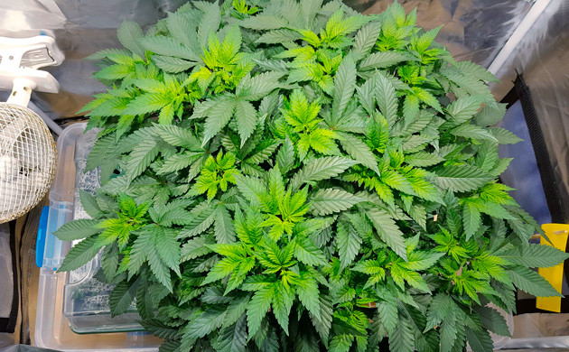 С девятой недели увеличил полив до 5 литров в сутки, растиха не проявила никаких признаков перелива и с удовольствием впитывает такое количество воды с удобрениями. Кустик заметно прибавил в росте. Его размер составлял 55 сантиметров. Осталось еще немного тренировок, возможно, суперкроппинг, а также аккуратно распределить колы в ячейки сетки, чтобы заполнить всё пространство.