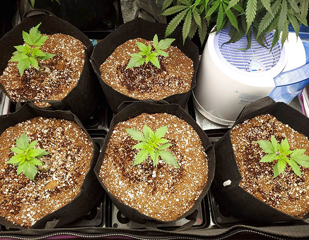 На 12-й день от каски растишки были пересажены в горшки и отправились в гроубокс. Там стоит еще пара уже дозревающих кустов, но скоро они будут срублены, и палатка будет полностью в распоряжении Super Lemon Haze. Теперь световой режим 18/6, до лампы 50+ см. После пересадки кустики не показали особого стресса и получили первую порцию удобрений: