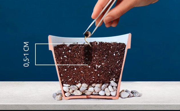 Обычно садоводы помещают семечко в грунт тогда, когда длина корешка достигнет примерно 5 мм. Глубина погружения в землю составляет 0,5-1 см. В этот момент самое главное не повредить нежный корешок. Поэтому гроверы обычно используют пинцет или просто сдувают семечко в почву с ватного диска. Корень должен обязательно смотреть вниз либо вбок. После этого лунку аккуратно засыпают землей. В первое время, пока над поверхностью земли не покажется росток, свет абсолютно не нужен.