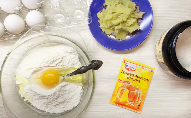 В подходящей по объему кухонной посуде смешиваем канна-масло, муку, яйцо, разрыхлитель и сахар, тщательно перемешивая до образования однородной массы.
