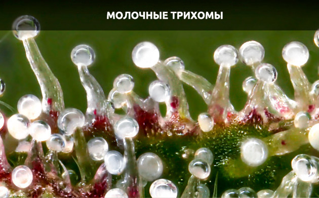 Контролируя изменение цвета головок трихом, гровер может оценить степень зрелости урожая. От начала цветения и до его середины смоляные головки будут преимущественно прозрачными. В то же время ближе к окончанию фазы трихомы будут мутнеть, приобретая молочно-белый оттенок. На поздних этапах созревания они становятся янтарными.