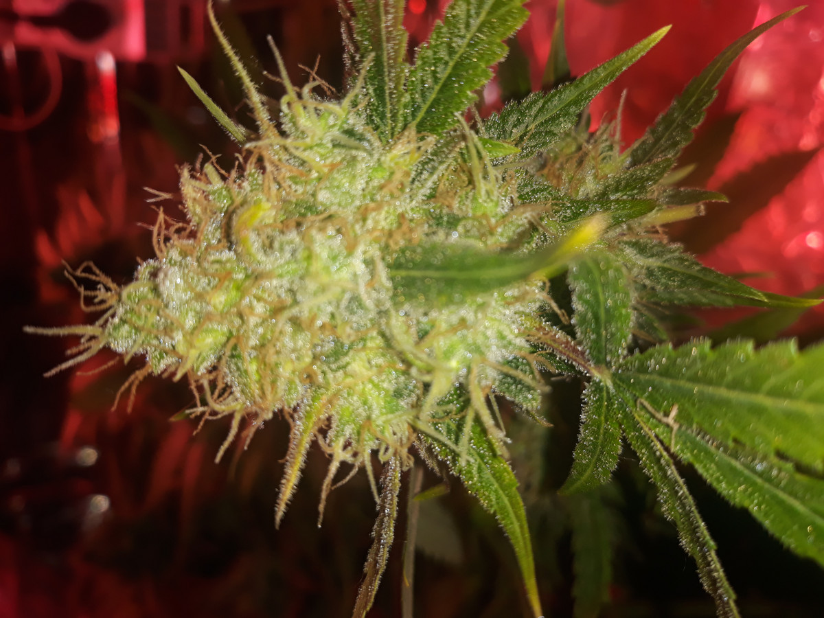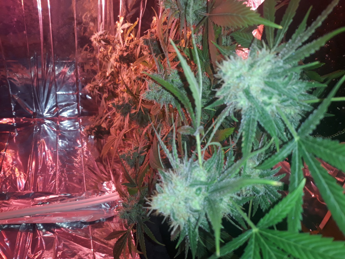 Через месяц перевода на цвет отключили отопление и влажность поднялась до 60%, плюс за три-четыре недели до харва зарядили постоянные дожди которые поднимали в комнате до 70% и в боксе соответственно выше 90%. Уже опасался что заведется плесень, ибо гребаный китайский вентилятор на обдув сдох, пришлось быстро ставить USB кулер из под ноутбука, слабенький ветерок хоть был и ладно. За неделю-две до предполагаемого харва сдох ёще и канальный вент на вытяжке, еле дождался 70% процентов коричневых пестиков и срезал пока плесень не началась, от греха подальше. Под микроскопом трихомы в основном были мутные и немного светлых, только на паре шишек заметил 1-2 янтарных.