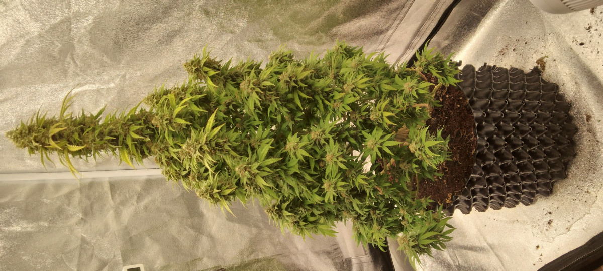 Тем не менее поднял куст от каски до харва за 4 месяца, на цвете держал более 60 дней. На веге пытался сделать FIM, но что то криво недорезал и в итоге макуха все равно росла, больше резать уже не стал чтоб не стрессовала. Применял LST по круглому караксу из аллюминиевой проволоки, после пятой пары листьев, думаю гнуть надо было начинать раньше, так как стебель уже успел одревеснеть и хорошо гнулся лишь после засухи в 2-3 дня