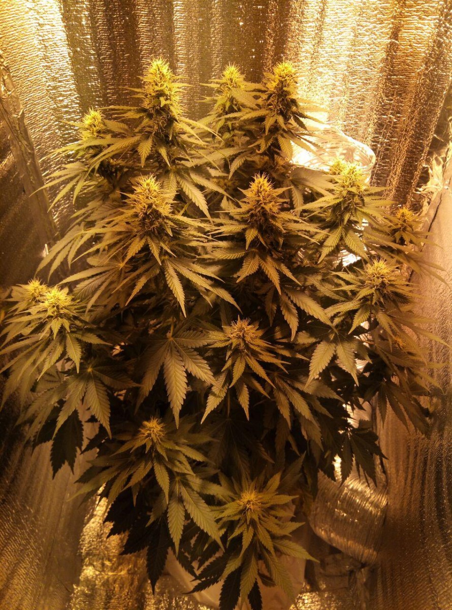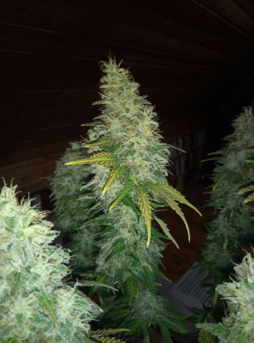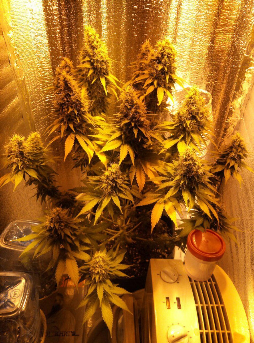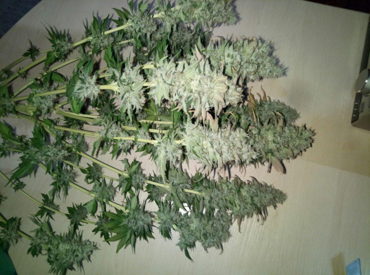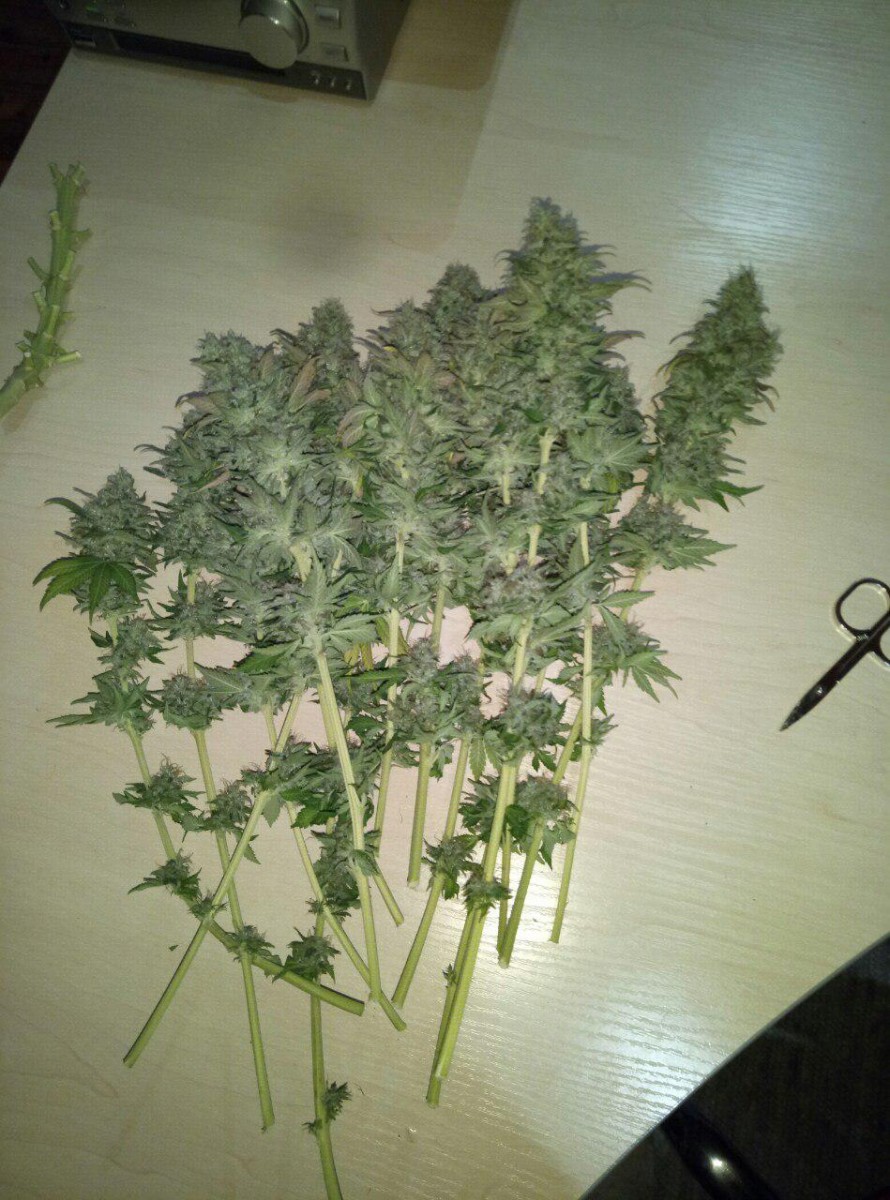 Сразу скажу, что я выращивал куст у себя в шкафу, в своей комнате чтобы меня не спалили родители. Основная проблема моего грова была в повышенной температуре (в среднем 30-31 градус во время всего времени) и низкой влажности на веге. Растил в lightmix от biobizz и поливал удобрениями bio bloom и bio grow от той же фирмы, еще керамзит на дне горшка-мешка(10л субстрата и 2л керамзита). Под дназ 150вт и с двумя вентиляторами и плохо работающим увлажнителем воздуха (влажность больше 45 мне поднимать не получалось). Купил угольный фильтр, но в бокс его ставить не пришлось потому что кустик очень слабо пахнет. Измеритель ph не приобрел, поливал водой, которую сам пью. Отрезал верхушку на 28 дне веге и перевел на цвет. После 30 дня цветения начал подрезать вееры, за пару дней до харвеста подрезал крупные листочки чтобы ускорить будущий маникюринг. Поливать чистой водой стал за 17 дней до харвеста, тупанул немножко.Брил шишки 3 часа, есть еще маленькая баночка сахарных листочков на масло. Сушил 5 дней в картонной коробке потому что в это время в боксе росли еще две девочки (про них позже). И пролечка в стеклянных банках в темном сухом месте с 15 градусами - продолжается до сих пор, уже 42 дня. Итоговые результаты: 92 дня - от каски. 64 дня - цветение. 55 см от земли, 20 здоровых веток и два карлика. 44 гр высушенного урожая Шишки: Это лучшее что я когда либо пробовал. До этого я сталкивался только с ассортиментом гидры правда. Но особенно после пролечки, шишки стали прям по настоящему классными. Очень воздушные. На фотографии видно идеальный белый пепел, вкус очень мягкий, с вапора еще лучше заходит. Запах у шишек острый, но не очень сильный, в целом отличный. С цитрусовым, свежим вкусом, из холодной банки прям вах, чувствуются нотки муската и мяты. Приносит яркое психоделическое воздействие. Arizer air 2 (вапорайзер) дает приятный, стимулирующий эффект. Заходит весь день очень хорошо, что с утра, что перед сном. Аппетит стимулирует лично у меня любой сорт и belladonna с этим тоже отлично справляется. Сейчас у меня растут еще две дамы, их я посадил за 16 дней до харвеста рядом с большим растением. Как вы поняли в режиме 12/12 от проращивания. Ростки были очень слабые первые две недели, но уже на третьей показали пол. Сейчас на 48 дне от каски растут + 2-4 см в день. Пока рано выносить вердикт способу 12/12 от рождения, но мне пока кажется, что не надо было тратить на него две полноценные семечки. В целом, отличный сорт, особенно людям, которые не могут позволить себе сильный запах.