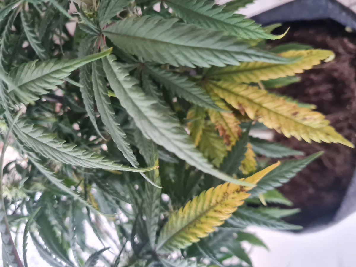 Привет Семяныч! Подскажи, что с растишкой. Джек херрер, 3 неделя цвета, листва пошла чахнуть, в чем дело? Свет Quantum board 120, Поливаю GHE компотом + Calmag. PH 6.4 по таблице от производителя, t в боксе 27/23. Помогите пожалуйста спасти растиху