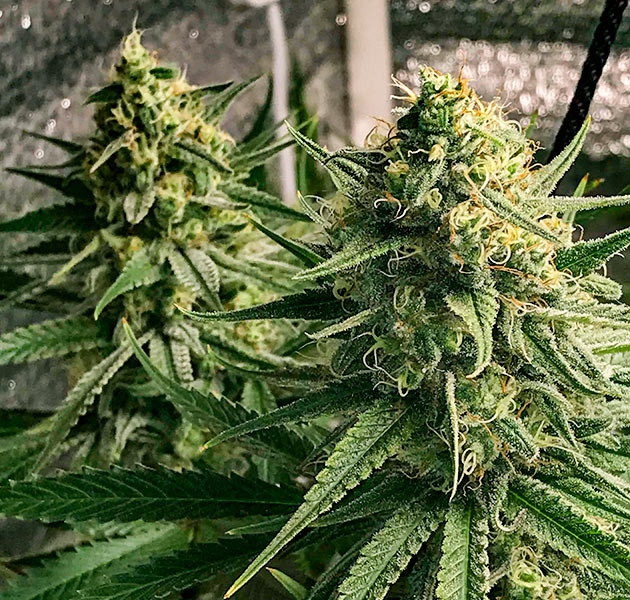 В 9 недель перевел на цветение, в 11 недель уже вовсю зацвели. На тренированном более сильном кусте формировались более крупные шишки, на мелком небольшие, но запах стоял обалденный. Клоны, кстати, тоже зацвели и тоже сформировали маленькие, но красивые предшишечки, хотя в 15 недель я заметил среди них и бананы. Удалил гермика вообще. А потом по неосторожности чуть не сломал крупную колу, но она прижилась.