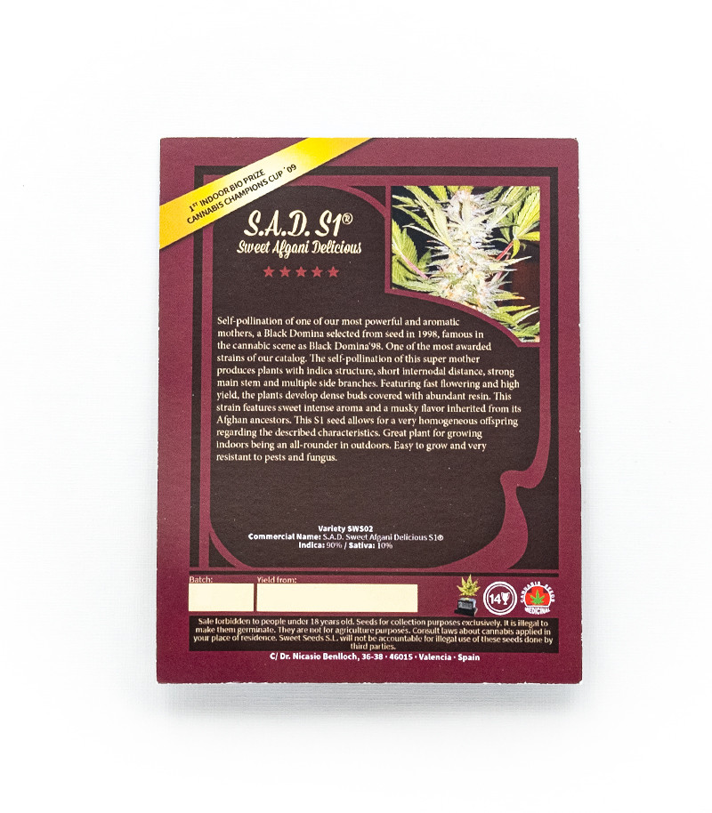 Родительница S.A.D. S1 – прославленный штамм Black Domina, афганская генетика которой защищает потомка от всех напастей, включая серую плесень, паразитов, распространенные болезни сада. Sweet Afgani Delicious получен самоопылением BD, прославленной селекции 1998 г. Кроме того, именно BD придает растению землистый тон в аромапалитре.